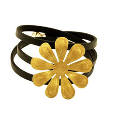 Bracciale fiore margherita, in Argento Placcato Oro 750% puntinato a mano, e cuoio Italiano larghezza circa cm 6, g 11,20