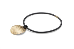 Collana in Argento 925 Placcato oro 750% Finitura durevole Patriarchi, collana in cuoio Toscano, chiusura a baionetta apribille pigiango con mezzo giro cm 42. Peso g 11,80. Cerchio diametro cm 48,0